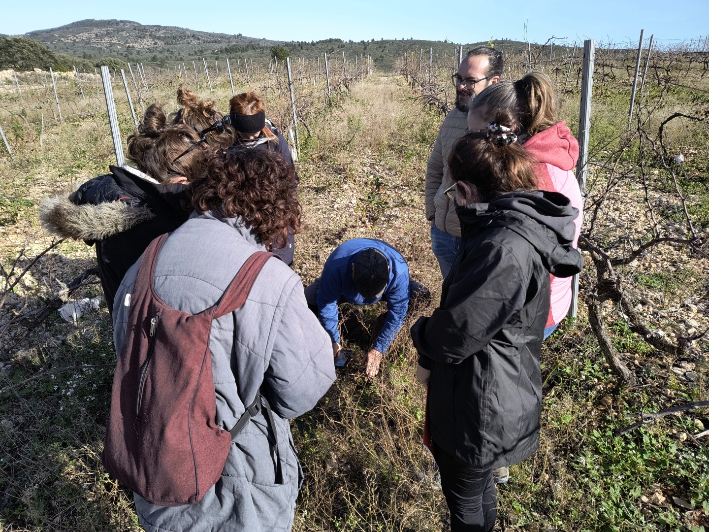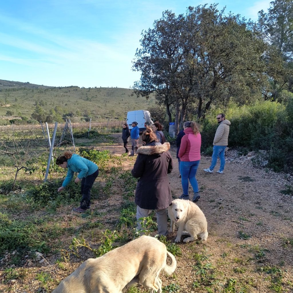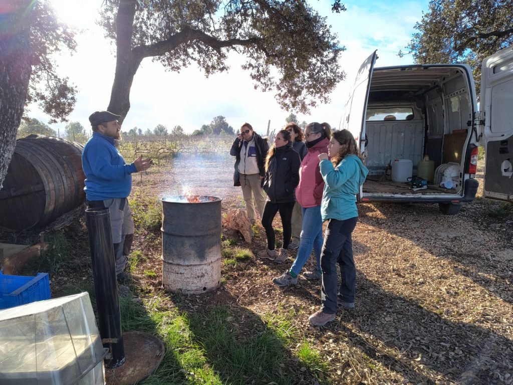 A media mañana, se realizó un almuerzo con la degustación de un vino regenerativo de la bodega Bellmunt i Oliver, donde se compartieron ideas sobre soluciones a problemas actuales de nuestra finca modelo y se compartieron experiencias personales de los participantes.