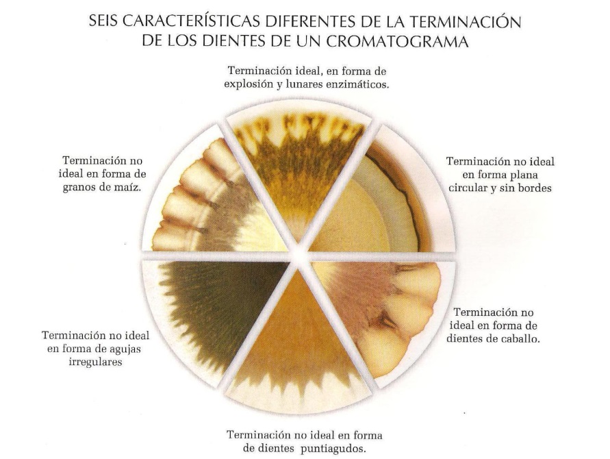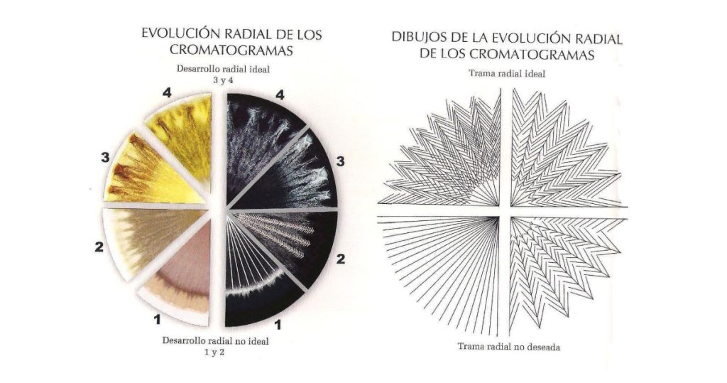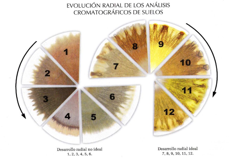 En el caso de la evolución radial, tenemos que tener en cuenta que un suelo cuya cromatografía muestra una evolución radial inexistente o de líneas rectas, es un suelo completamente empobrecido y destruido.